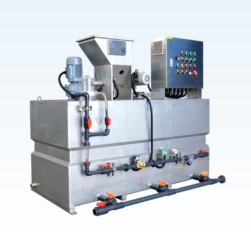 PAM全自動(dòng)泡藥機(jī)是一種一體式的,具備將PAM干粉連續(xù)制備成一定濃度(通常0.05~0.2%)溶液的裝置。該裝置適用于高分子有機(jī)絮凝劑(PAM)的制備與投加,用戶只需將藥劑干粉直接加入設(shè)備的料斗中,即可實(shí)現(xiàn)全自動(dòng)的投料、溶解、熟化、儲(chǔ)存、計(jì)量加藥等過程,整個(gè)過程無需人為操作,完全自動(dòng)運(yùn)行。料斗中的粉狀藥劑經(jīng)定量給料裝置送入混合器中,與水進(jìn)行完全混合后進(jìn)入溶液箱中,混合液經(jīng)多級(jí)攪拌后形成均一濃度的溶液,最后進(jìn)入貯液箱內(nèi),根據(jù)工藝需求用定量式泵浦進(jìn)行投加。
