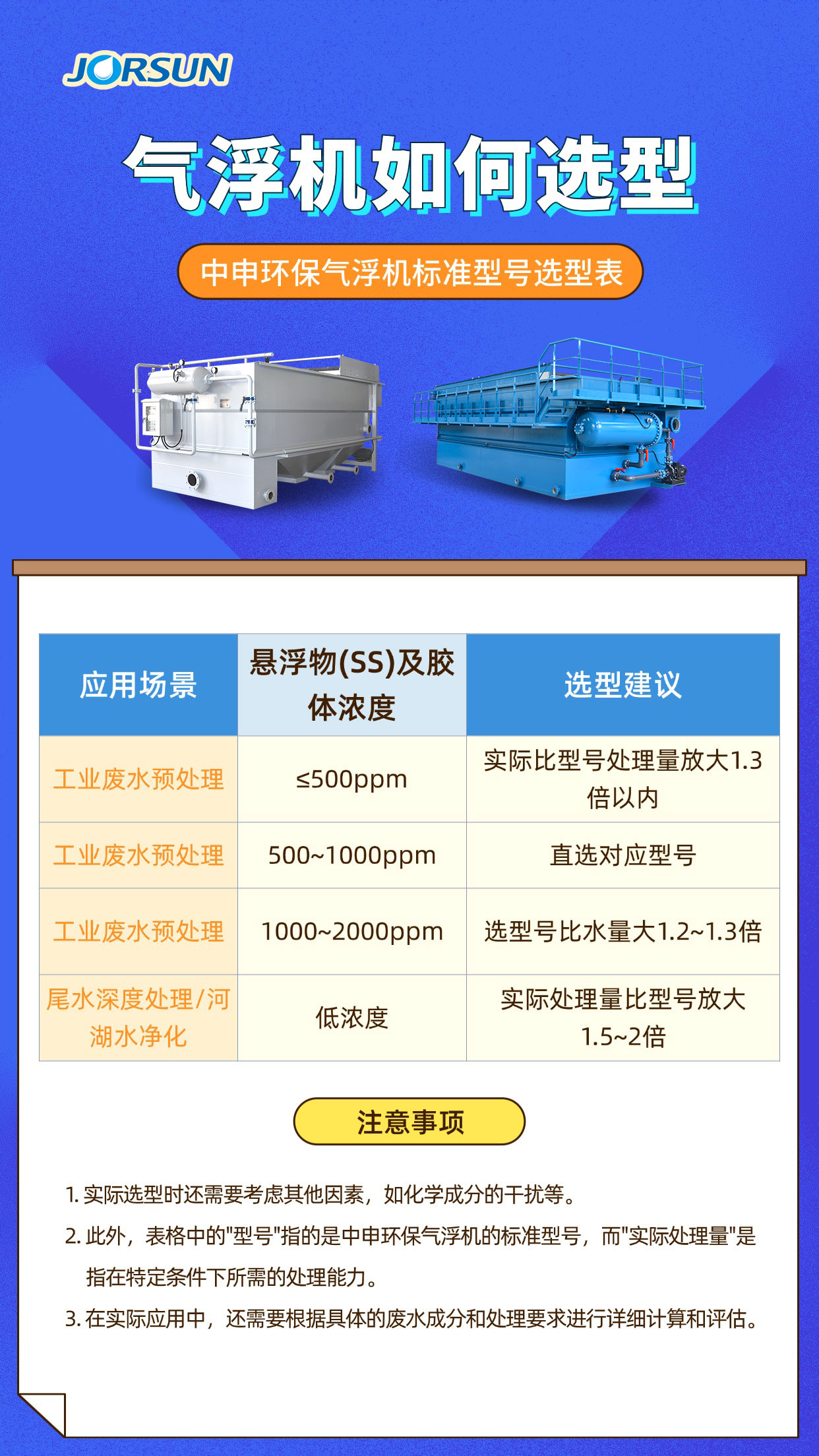 工業(yè)廢水預處理,通常采用沉淀型氣浮,按SS及膠體濃度500ppm及以下:實際比型號處理量放大1.3倍以內。SS及膠體濃度500~1000ppm,可以直選對應型號;SS濃度1000~2000ppm選型號比水量大1.2~1.3倍。工業(yè)廢水成分比較復雜,還需充分考慮化學成分的干擾削弱氣浮作用??傮w上,工業(yè)廢水預處理選型考慮留有余量,保守為好。